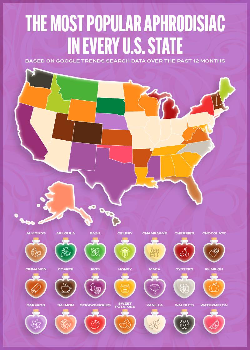 Alt: U.S. map plotting the most searched aphrodisiac in every U.S. state.